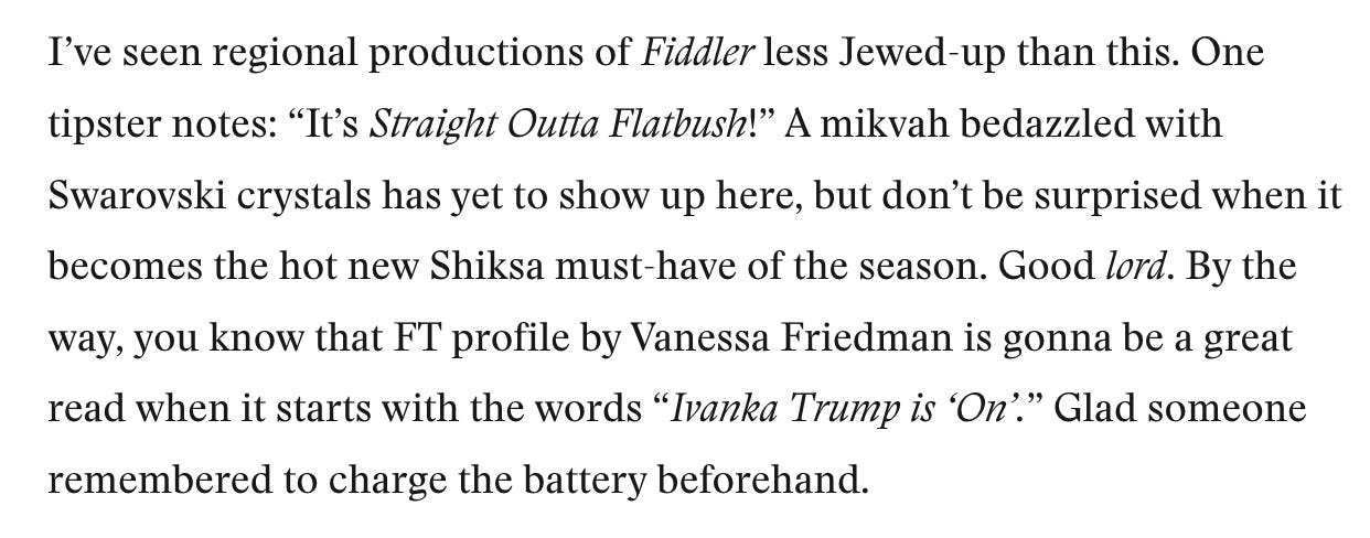 Pal, don’t flatter yourself, you might think. ‘Couldn’t have been that bad. For more on why I assumed Jared might not want me in his employ, look no further than just one of my Voice columns from back then, a throwaway riff on a Financial Times profile (with one of the funniest accompanying photos I’ve ever seen) of Jared’s new wife, the freshly-converted Ivanka Trump: